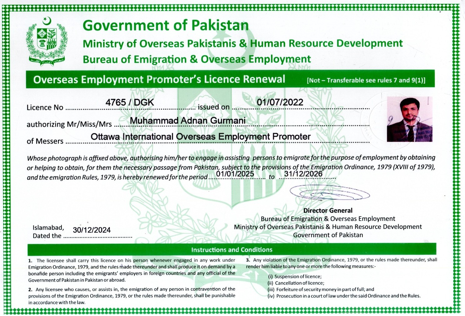 Ottawa International Overseas Employment Promoter OTTAWA INTERNATIONAL is a recruiting Agency located in Pakistan. We are licensed by Ministry of Overseas Pakistanis and Human Resource Development. Contact Us Our Services We provide Recruitment Services to foreign Employer from Pakistan Contact us What We Offer Recruitment Services: We connect foreign employers with qualified candidates from Pakistan.Visa Processing: We handle K.S.A Work Visa processing for successful candidates.Manpower Demand Processing: We efficiently process foreign employer demands within a set timeline.Visa Protection Services: We provide assistance with K.S.A Work Visa protection in Pakistan. Mission & Vision Our MissionTo provide the most suitable and efficient manpower to foreign employers, gaining a competitive edge in the recruitment industry.Our VisionTo represent our company globally, offering the best and most efficient human resource services. Recruitment Procedure Our Recruitment ProcessDemand Acquisition: We gather foreign manpower demands from employers.Advertising: We advertise these demands across Pakistan.CV Collection: We collect CVs and screen applicants.Shortlisting: Candidates are shortlisted based on their qualifications and experience.Interviews: We conduct interviews with shortlisted candidates.Selection: We provide the most suitable candidates to our foreign clients.